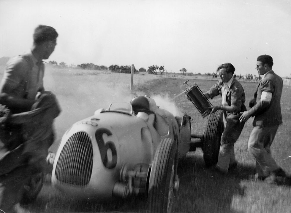 Nur Augenblicke später trifft es Rosemeyer. Aus der Ferne sehen Zuschauer plötzlich eine helle Flamme aus den seitlichen Öffnungen seines Wagens schlagen. Ein Leck in der Benzin- oder Ölzufuhr – später wird man darüber streiten – entzündet sich am glühenden Aggregat. Rosemeyer wirft das Auto herum, bringt es unter dramatischen Umständen zum Stehen und springt aus dem Wagen, noch bevor die Flammen sich ausbreiten. Die Szene wirkt wie ein Echo des Varzi-Unfalls, nur Sekunden versetzt. Der schnellste Mann des Tages steht am Streckenrand, rußverschmiert, frustriert – aber unverletzt. Sein Rennen ist vorbei.